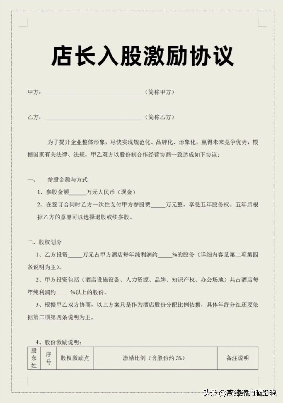 当下生意不好做,其中有种思路就是把员工变成元老,特别是一些小餐饮、蛋糕店等等的小项目,如果按照公司直营的方法,规模越大,管理成本越高,最后将出现一大堆的大企业病,失去竞争优势,而有一些特别会设计股权模式的创业者,比如公司投80%,店长投20%的现金,但是可以分得60%的利润,店长会拼了命的干,如果再扩展一下,店长除了经营自己的店,还有义务必须培养新的店长出来,新的店长如果也变成某一家店的股东了,老店长还可以参与新店长店里5%、10%的分红,公司把所有的权利给下放了,反而可以激起所有人的干劲。