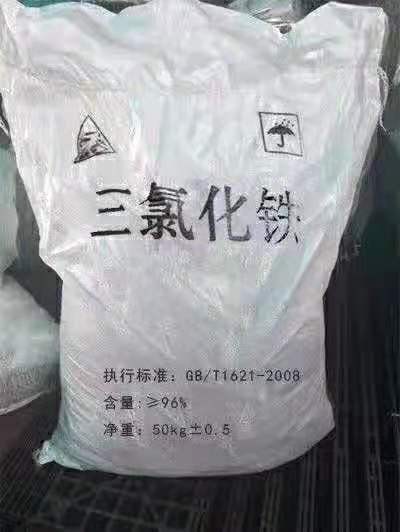 三氯化铁是另一种常用的无机低分子凝聚剂,产品有固体的黑褐色结晶体,也有较高浓度的液体。其具有易溶于水,矾花大而重,沉淀性能好,对温度、水质及pH的适应范围宽等优点。