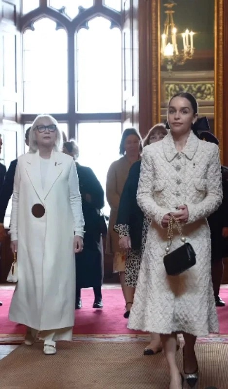 在特写镜头下,艾米莉亚·克拉克展现出与象牙白套装中的年轻伶俐形象截然不同的一面。皱纹在她的脸上勾勒出岁月的痕迹,而花白的头发则透露出她的成熟和经历。这样的外貌反差并非是一种缺陷,相反,它是对时间流逝和生命历程的真实呈现。这种自然本真,恰恰是让观众感叹的地方。