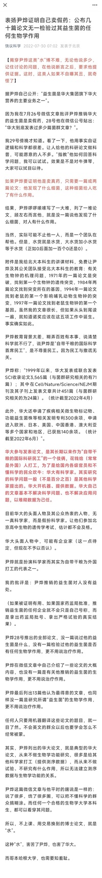 中国生物物理学会肠道菌群分会副会长蓝灿辉表示,华大的益生菌不是药,但是也不是‘三无’产品。华大把它定义为食品范畴。饶毅说它是假药,有点偏颇。但尹烨的问题是在带货的时候太绝对了,益生菌到底有什么属性,行业还没定论,华大宣传中不严谨地推销对减肥、抑郁都有用的观点,缺乏科学循证,很容易误导消费者,这或许就超出了生意的底线。