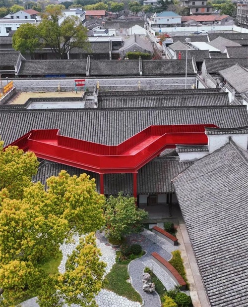艺术馆整体布局充满张力和特色,大胆运用红色元素,红桥、红灯笼跳脱于青砖灰瓦,实现了传统与现代的完美融合