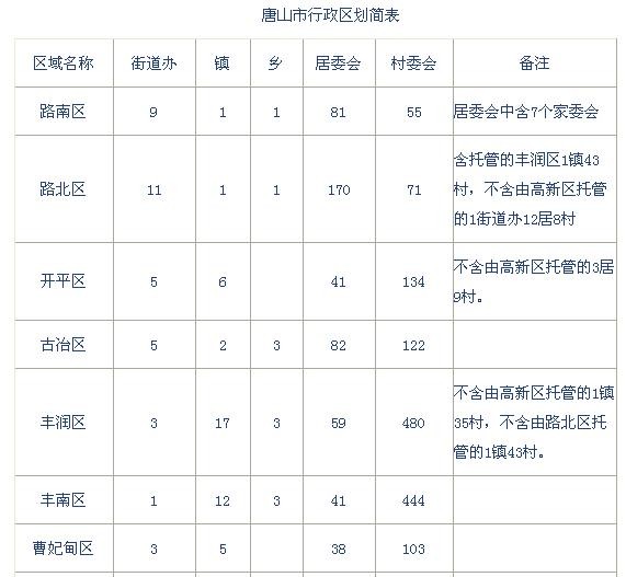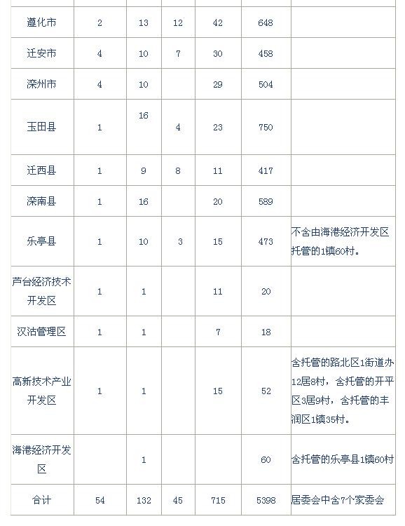 唐山市辖3个县级市 ( 迁安、遵化、滦州 ),4个县 ( 迁西、玉田、滦南、乐亭 ),7个区 ( 曹妃甸、路南、路北、开平、古冶、丰润、丰南 ),4个开发区 ( 海港经济开发区、高新技术产业开发区、芦台经济技术开发区、汉沽管理区 )。全市有 45 个乡(含3 民族乡)、132 个镇、5398 个村委会、54 个街道办事处、715 个居委会(含7 个家委会)。
