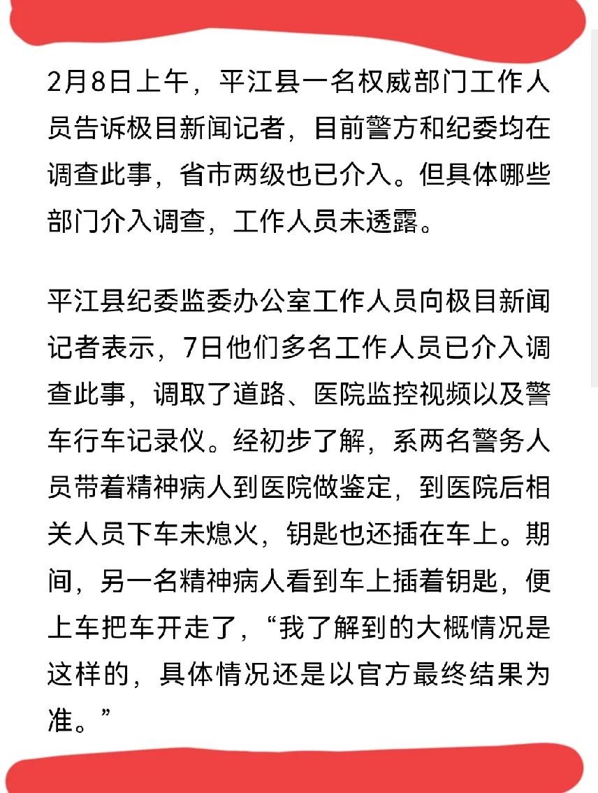 2月8日,根据“极目新闻”的报道,平江县纪委监委工作人员做出回应:在调取车辆行驶经过道路的视频、车辆行车记录仪、以及医院监控后,确认警车驾驶人员为一精神病人。民警带着两个精神病人到医院做鉴定,下车后,警车没有熄火,没有拔钥匙。后来,其中一个精神病人看到车辆没有熄火就把车开走了,才酿成如今的事故。