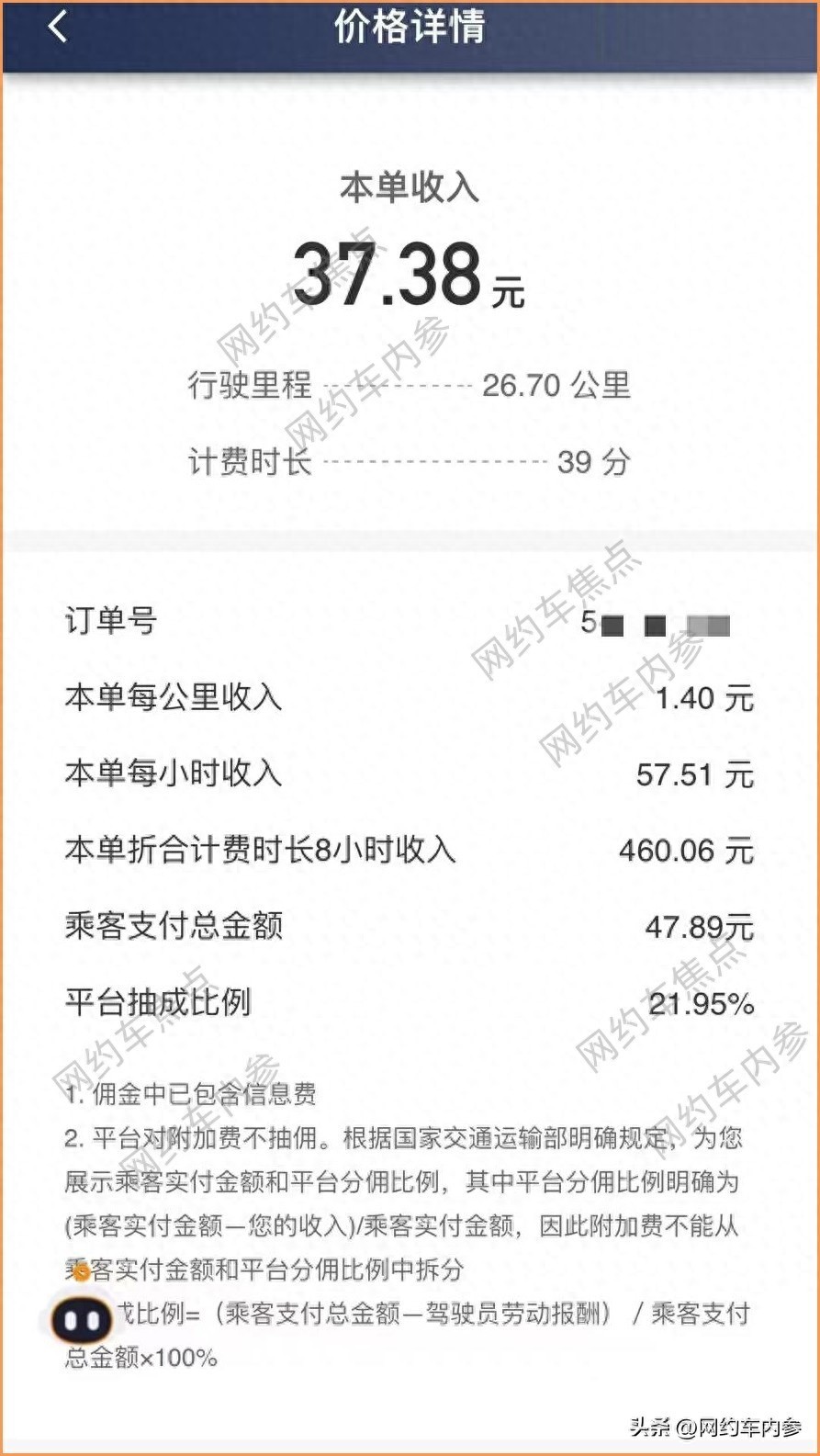 邱师傅说,前几天在阳光出行上接了一个实时订单,从给力线业到南洲新苑,26.7公里耗时39分钟收入37.38元,算下来1.4元一公里。