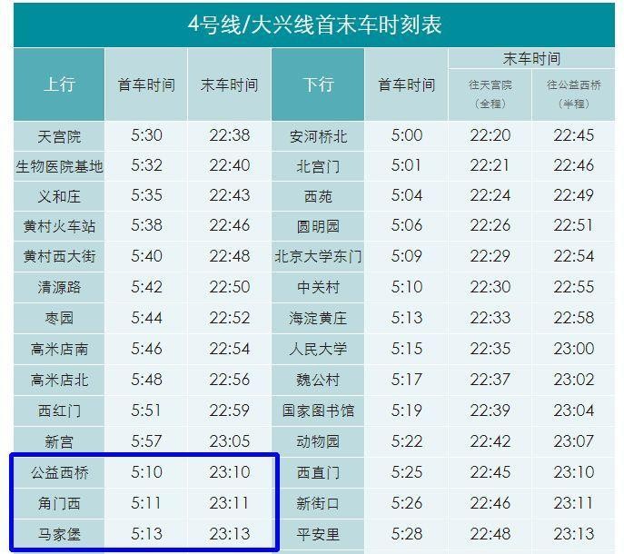 北京地铁4号线和大兴线的列车时刻表如下所示。