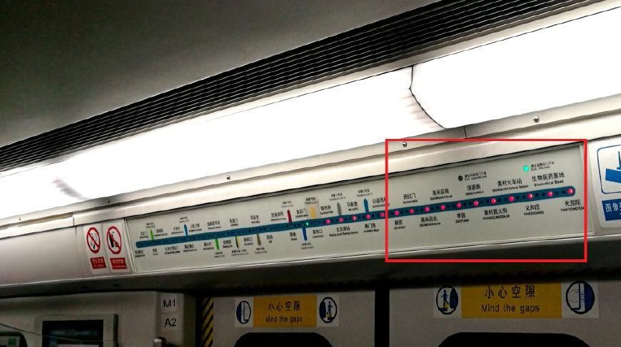 下面是北京地铁4号线、大兴线车厢上面的线路图。