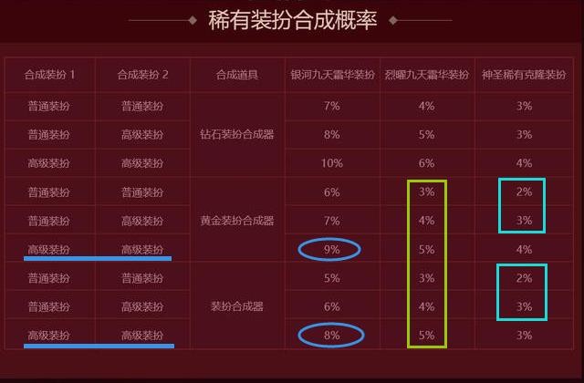 这是官方公布的最新合天空概率。钻石装扮合成器的概率最高,但是价格有点贵。在高级+高级装扮合成的情况下,黄金合成器和普通合成器合出银河九天霜华装扮的概率只相差1%。如果你想合成烈焰九天霜华装扮的话建议使用普通合成器,因为概率和黄金合成器一模一样。