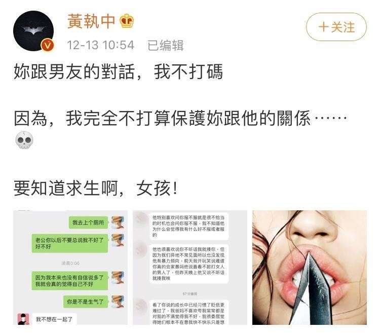 在给黄执中的私信中,女孩怀疑自己遭到男友的“精神控制”但不肯定。她说:“是我太矫情吗?我觉得我也被洗脑了,不知道什么是对错。”黄执中则回应她:“请赶紧离开!不管他是否道歉,都赶紧走!”