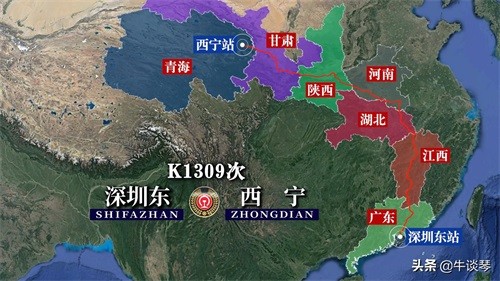 K1309次列车运行线路图:深圳东开往青海西宁,全程3045公里