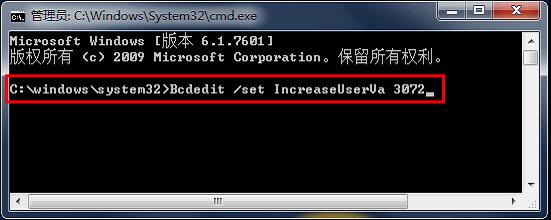 第四步:输入命令 :Bcdedit /set IncreaseUserVa 3072