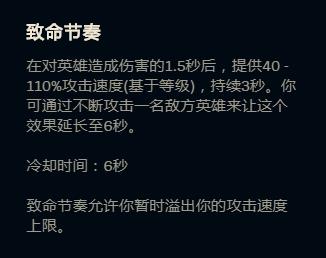 由于致命节奏的关键属性是攻速和移速,所以这代表玩家对薇恩的操作将变得十分轻松,也就是只要进攻思路清晰,基本没有人能可以碰到薇恩,更何况在纠缠这段时间,也会为队友的输出节点更上一个台阶。