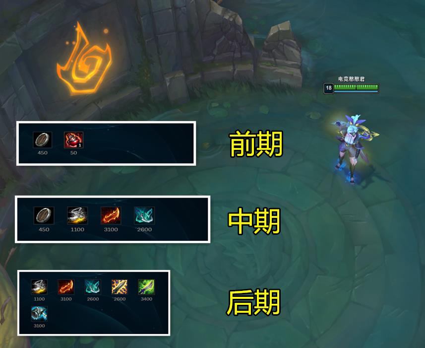 前期核心出装为多兰盾、攻速鞋,首件装备为羊刀、其次是幻影之舞+电刀,若对方下路辅助是消耗型法师可优先智慧末刃,最后才以冰锤、水银弯刀收尾。这样一来不仅可以限制敌方前排突进,又能利用水银弯刀的爆发移速弥补走位失误。