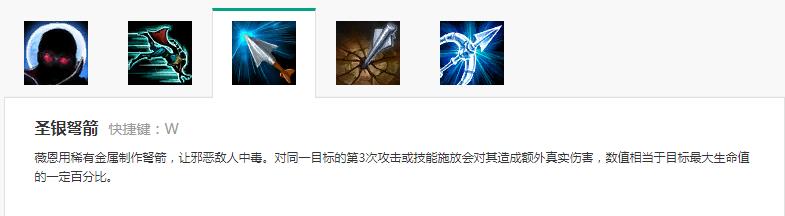 【圣银弩箭】是薇恩所有流派的核心输出技能,满级它能造成目标14%最大生命值伤害,俗称切肉神技。