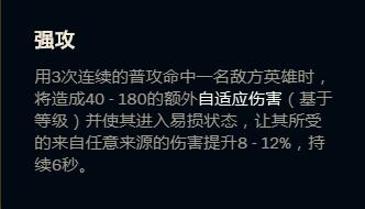 针对前期对线分析,强攻收益在于第三下平A可造成40-180额外伤害,搭配14%最大生命值可以三下平A直接消耗对手一半血量,但缺点是无法持续保持作战能力。