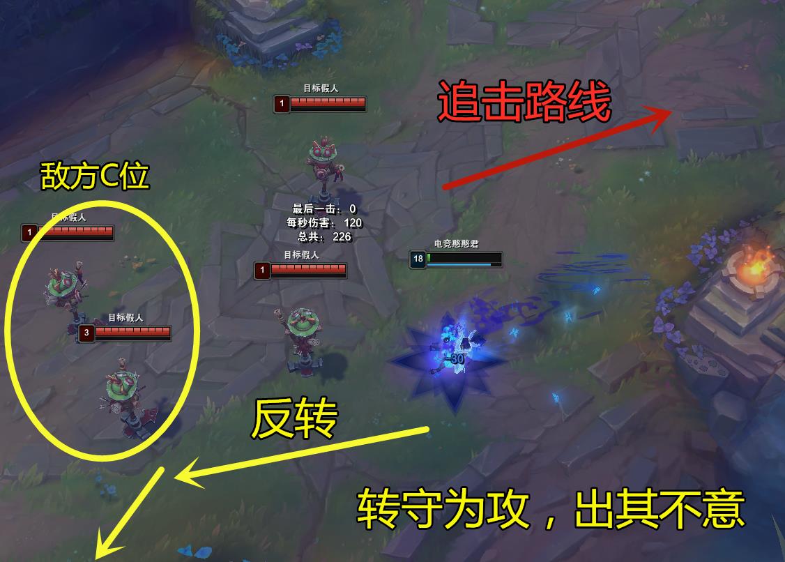 反向Q是指利用大招+Q隐身来反向逃跑或拉开身位,让对手处于一个预判失误的尴尬局面。