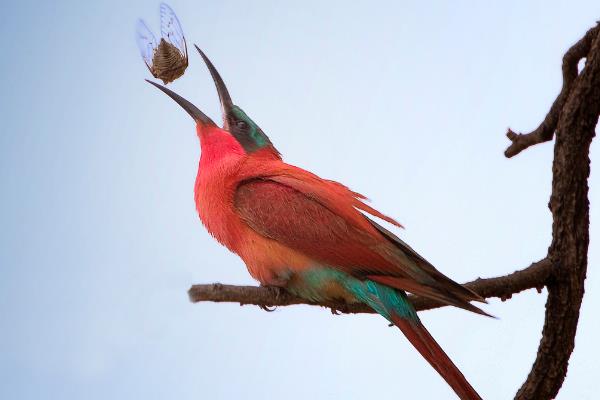 胭脂蜂虎之所以被称为蜂虎也是由于它有着特殊的嗜蜂风俗,更加喜佳吃蜂蜜和百般蜂类,天然通常也会由于情况和时节的变革而吃一些其余的虫豸,例如白蚁、蝴蝶、象甲、榆毒蛾等,它们常常会像黑头翁那样在遨游的历程中抓逮虫豸,而安息的时间则经常休憩在树梢大概者电线上,它们腾飞的时间则多是跳下树枝,呈弧形进取飞起。