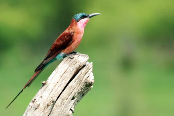 胭脂蜂虎的脸色十分明显,它的浑身大局部脸色都浮现赤色,而头顶和臀部则为显眼的亮绿色,更加是党羽重要浮现深赤色,而且它最明显的特性便是尾巴十分建长,在尾上长有12根羽毛,没有过也有局部个别浮现特其余方形尾,也有局部个别的尾巴上惟有几根羽毛比拟长且细。以至还有少量胭脂蜂虎的眼睛处长有玄色的宽条纹,反面为紫色,而胸部为葱绿,向后渐突变白。