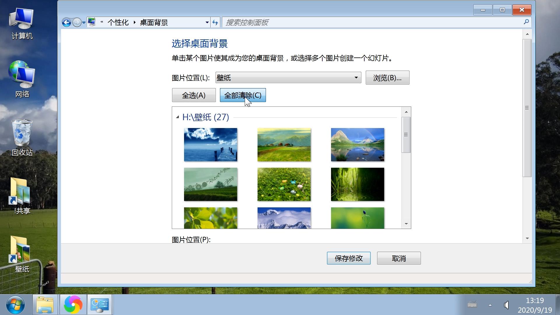 如果要取消自动更换桌面壁纸背景,还是在桌面背景这个窗口中,上方有一个全部清除按钮,点一下然后保存修改就就可以了。