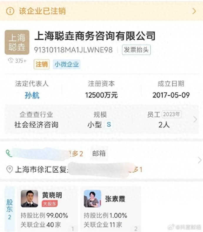据悉,该公司由黄晓明持有99%股权,黄晓明母亲张素霞持有1%股权,注册资本为12500万元。