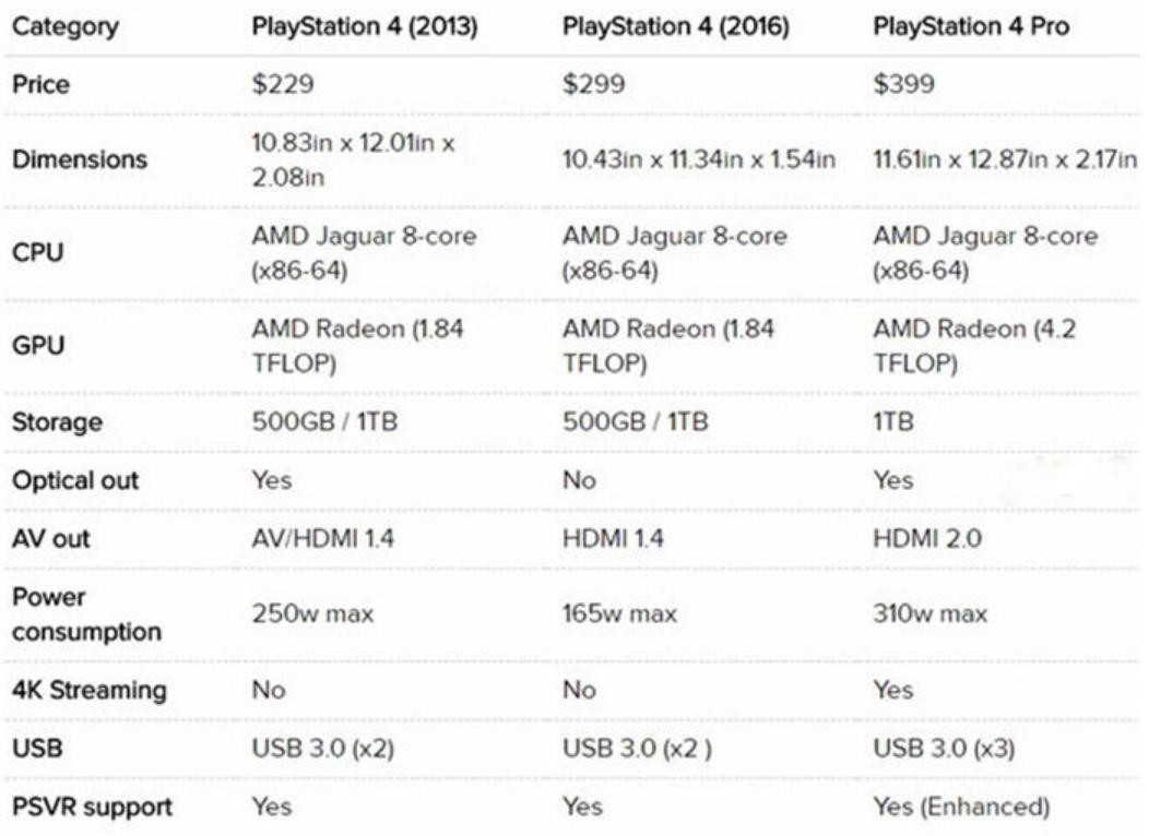 2、在性能方面,虽然两个机器都是用的AMD旗下Jaguar x86-64八核处理器,但pro的主频从1.6GHz提高到了2.1GHz,整体配置上还增加了1GB内存;显卡方面的性能就更强大了,相比slim提升一倍,主要体现在运行游戏的时候更加流畅。
