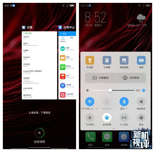 智能手势方面,结合全面屏带来的操作改变,努比亚Z18的智能手势也做了相应的改变。底部中间上滑返回桌面,上滑悬停进入多任务,左侧上滑打开控制中心,右侧上滑返回上一层,而大屏手机上常用的分屏功能也直接放到了控制中心里,使用更为方便。