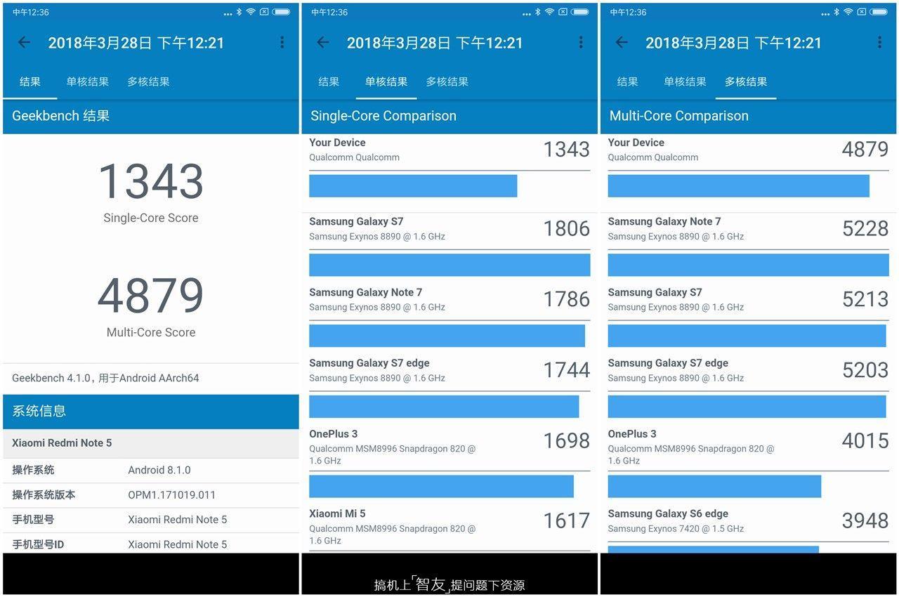 在Geekbench 4.1.0的处理器跑分中,这颗八核心的骁龙636在单核跑分项目中获得了1343分的成绩,多核项目中获得了4879分的成绩。骁龙636处理器的综合性能优势对于红米Note 5的定价而言已经超过了期望值。在价位相近的安卓机型中,性能可与红米Note 5匹敌的屈指可数。