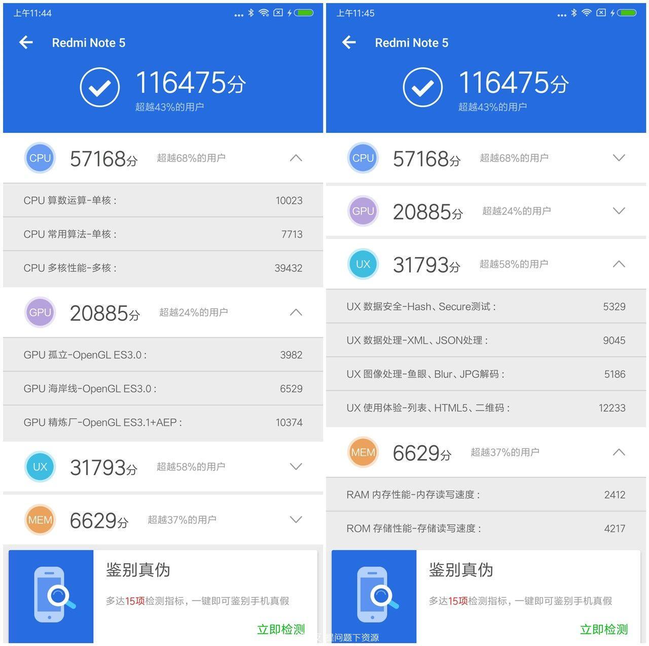在安兔兔评测中,红米 Note 5获得116475分的成绩,其中GPU得分为20885分,与骁龙660保持了一定的距离,这样的性能表现符合骁龙636的产品定位,市面上的各类休闲游戏都可以轻松运行,运行大型游戏时对特效进行调整也可完整体验;31793分的UX性能成绩在红米 Note 5的价位中表现出众,这意味着红米 Note 5的系统流畅度达到了千元机中新的高度;CPU性能和RAM性能分别获得了57168分和6629分。