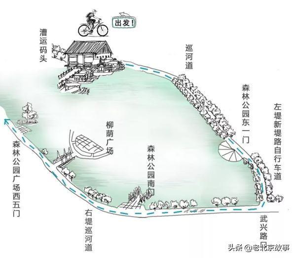 漕运码头 → 巡河道 →森林公园东一门 →左堤新堤路自行车道 → 武兴路口右转 →森林公园南门 → 右堤巡河道 → 柳荫广场 →森林公园广场西五门
