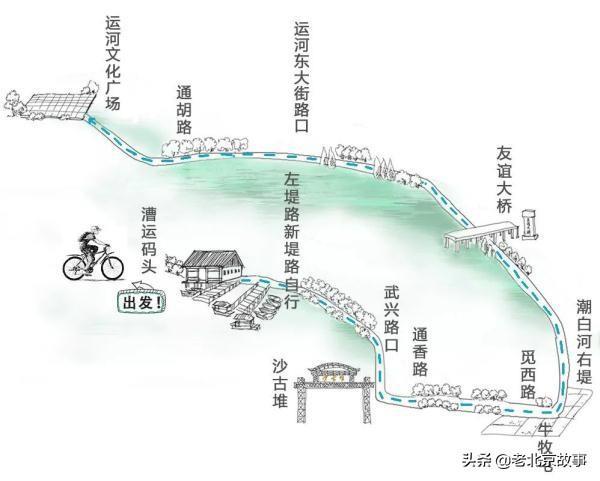 漕运码头 → 左堤新堤路自行车道 → 武兴路口→ 沙古堆 → 通香路 → 觅西路 → 牛牧屯 → 潮白河右堤→ 友谊大桥路口 → 运河东大街路口 → 宋郎路口 →芙蓉东路 → 通胡路 → 大运河文化广场