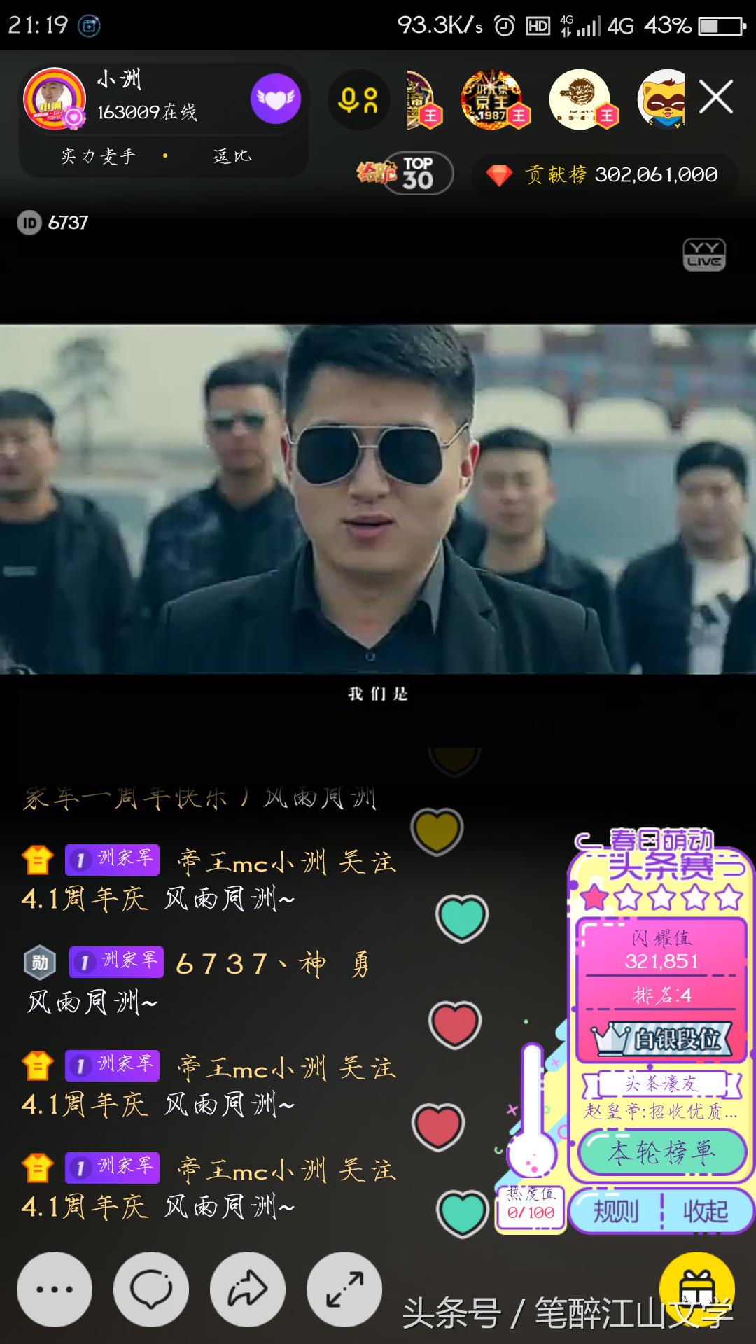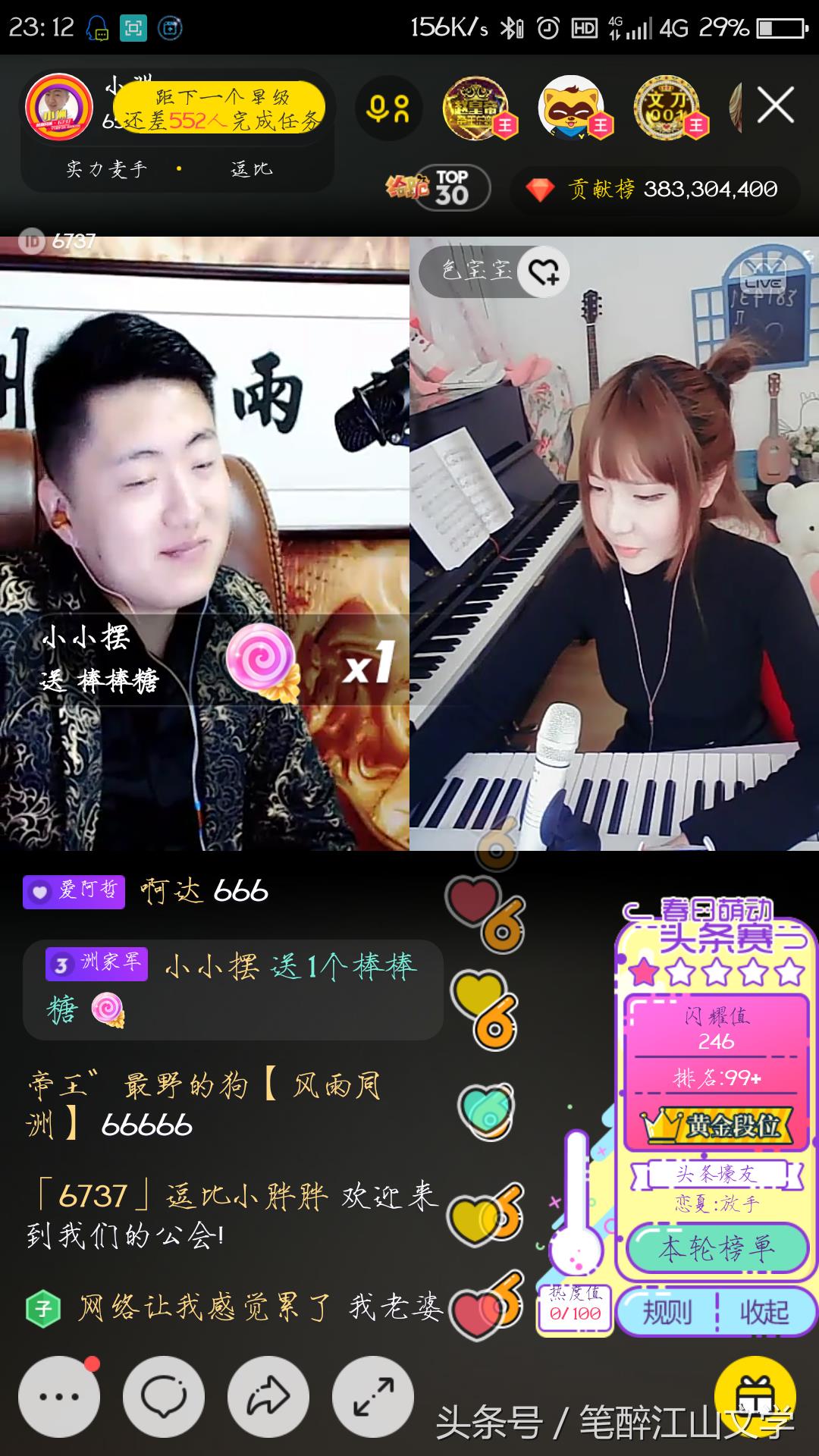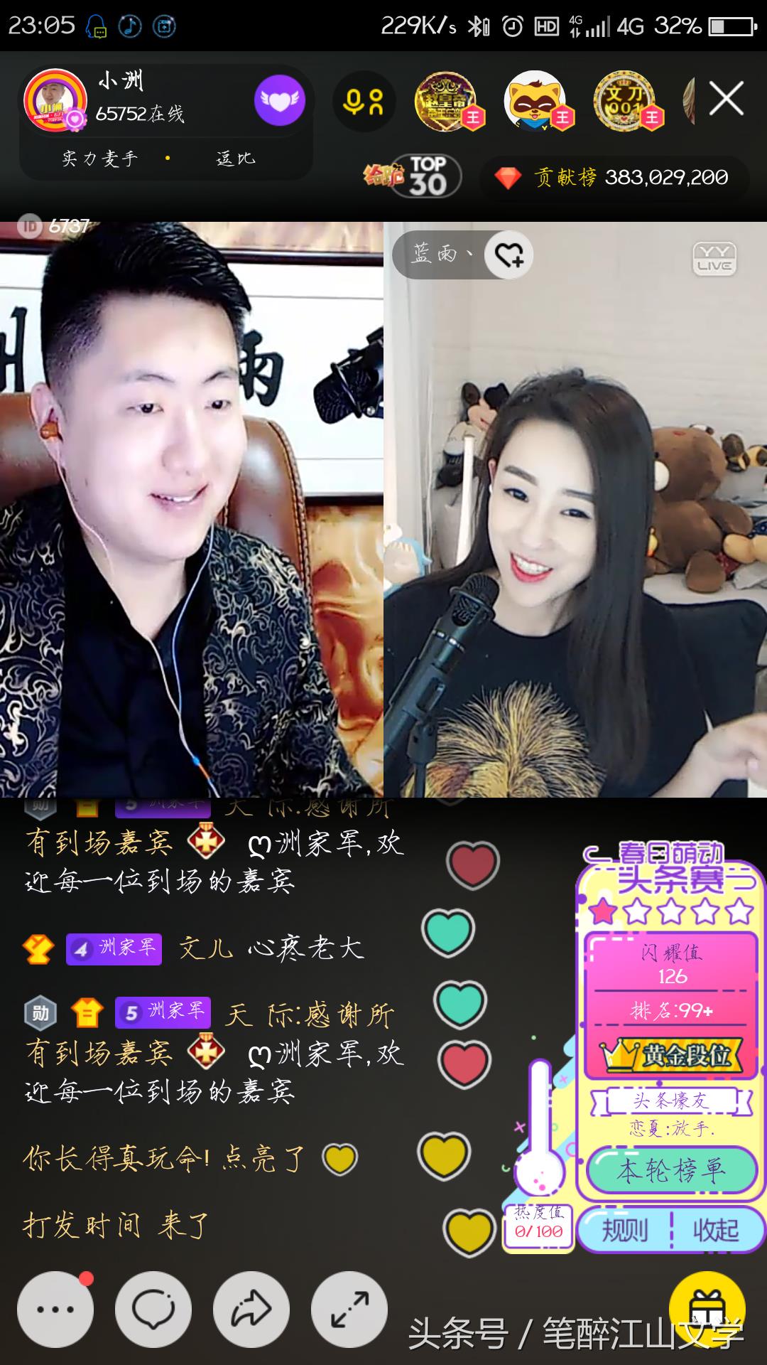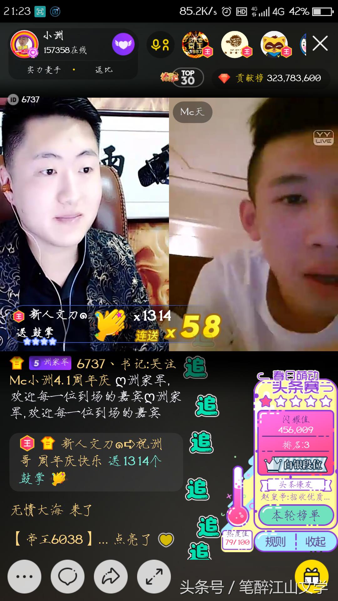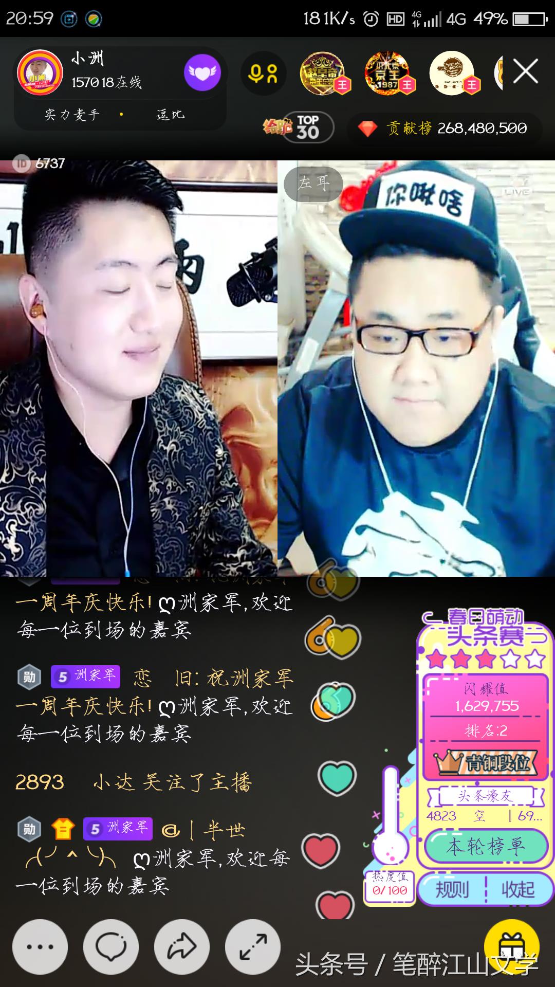 首先是,传说与小洲有帝王一哥之争的左耳来到了现场,看来那所谓的一哥之争不过是个玩笑罢了,我耳非常大气的刷了五位数的礼物!也送上了最衷心的祝愿。