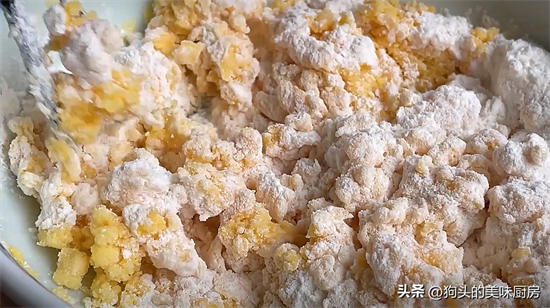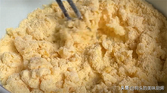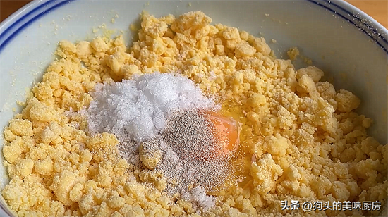 1.准备100克玉米面,放入盆中,用100克开水烫面,烫过的玉米面口感会更好,把它们搅拌成颗粒状。放在一边稍微晾凉。