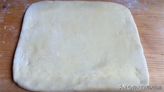 6.接着用擀面杖把它擀成正方形或者长方形的面片,厚度在0.5厘米左右,可以更厚一点。