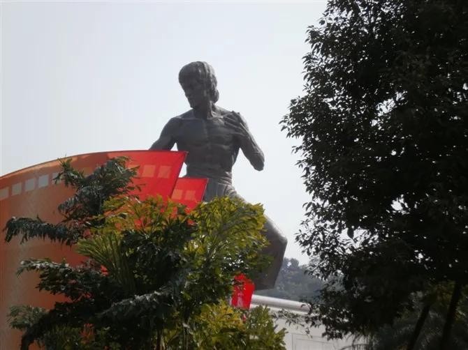 李小龙乐园顾名思义,为了纪念李小龙。景区最大的亮点就是高18.8米的李小龙铜像。这个铜像很有特点,像咏春拳起手式,也像他自创的“截拳道”,造型攻守兼备,刚劲有力,威风凛凛,充分展示李小龙“武”者形象、“功夫之王”形象。