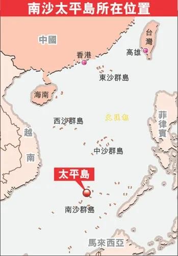 南沙群岛位于北纬3°35′至北纬11°55′,东经109°30′至117°50′,它东西长约905公里,南北宽约887公里。太平岛位于南沙群岛北部的中央。太平岛距离西沙永兴岛约760公里;距离海南省榆林港约926公里;距离高雄港1600公里。它西距越南金兰湾约611公里;东距菲律宾苏比克湾约815公里。岛上淡水资源丰富,水质极佳,上面有数口水井,可以满足生活需要。