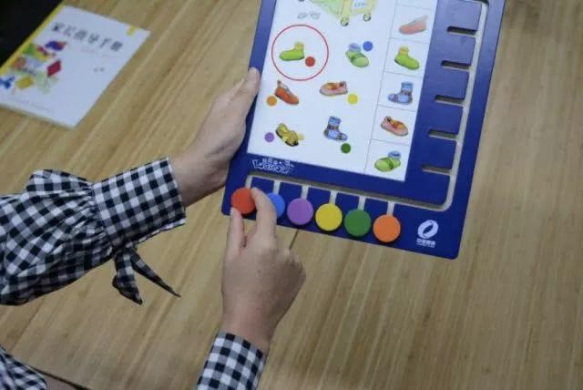 ◤家长:“那你可以找到下面红色的圆盘,放到右栏绿色的袜子旁边吗?”