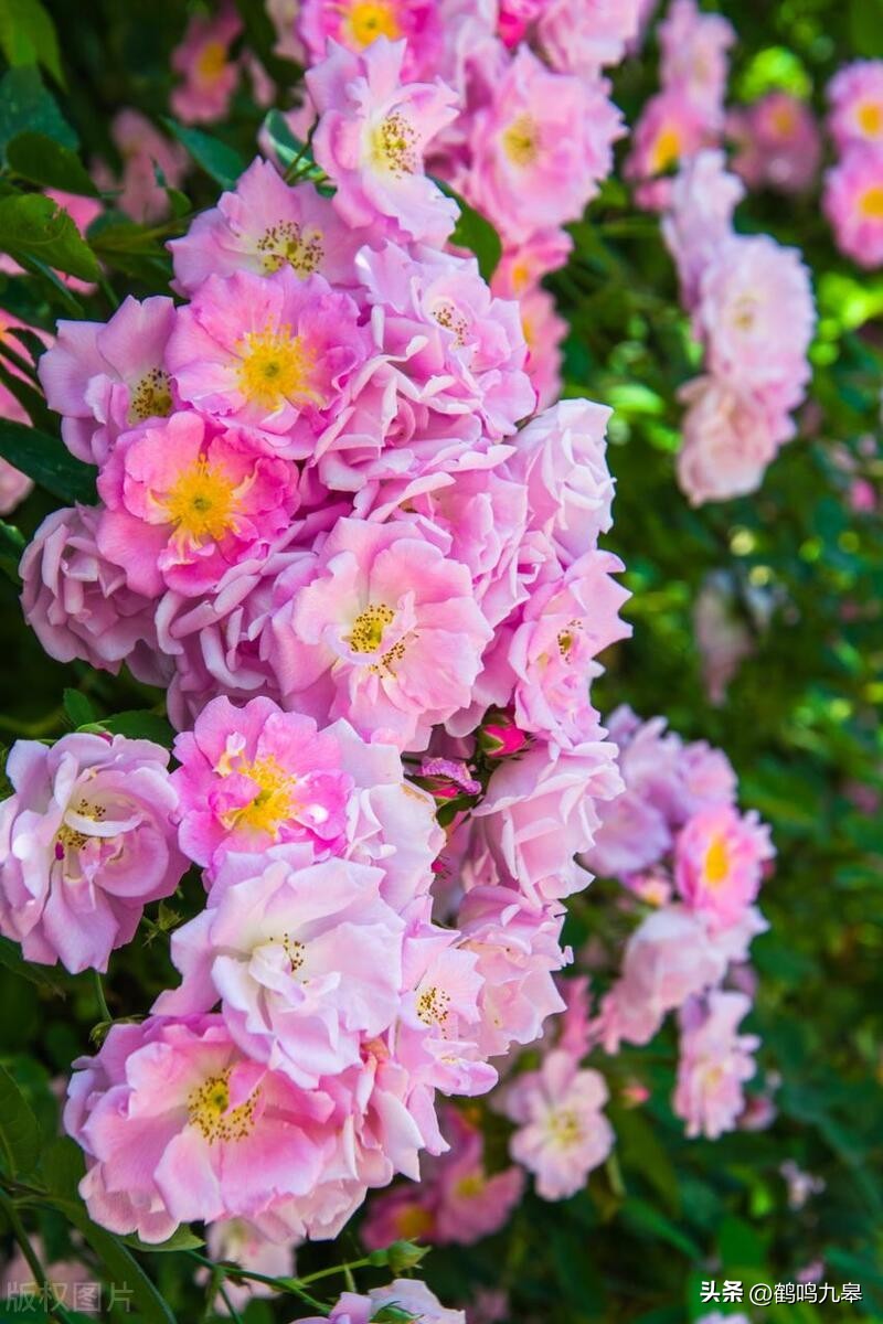 蔷薇:藤本植物,花小而密集,常用于制作花墙。蔷薇的叶子两面都有柔毛,叶片边缘是齿状的。蔷薇的花一般是6-7朵簇生。