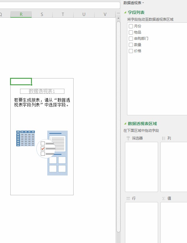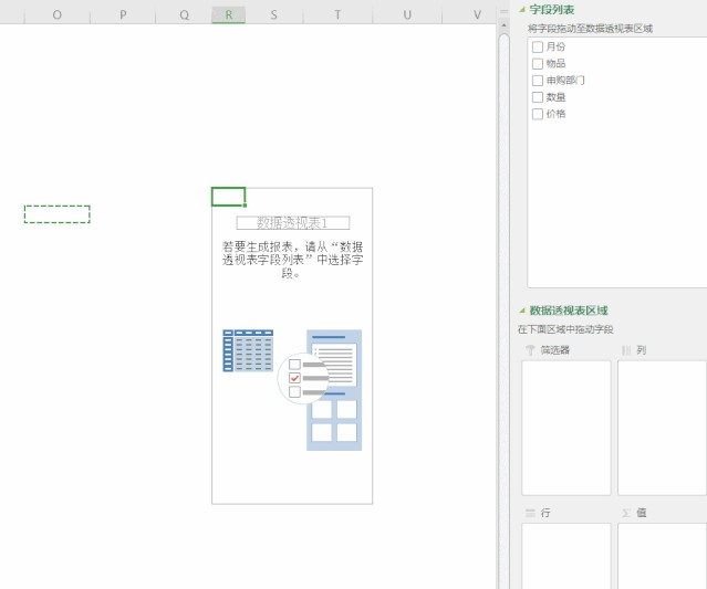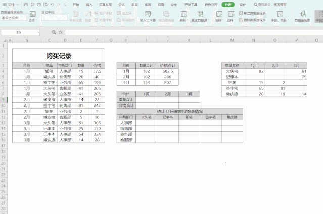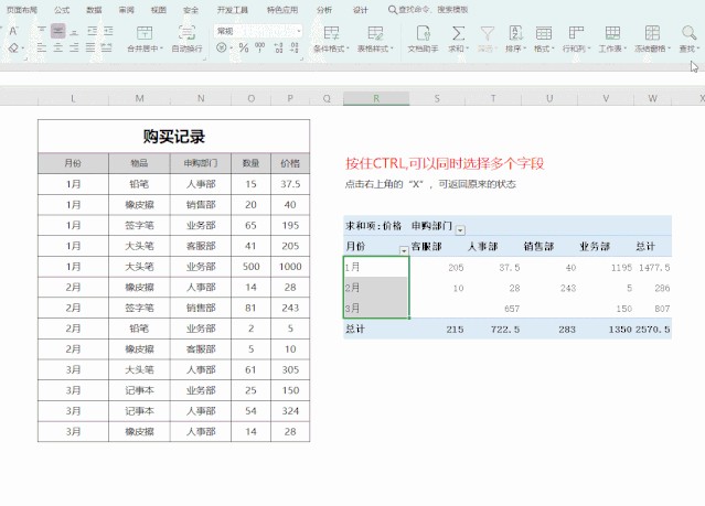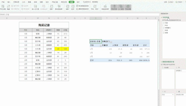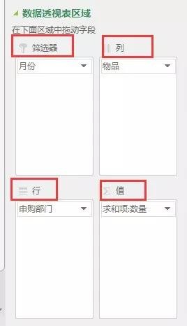 在这份购买记录当中,“月份”、“物品”、“申购部门”、“数量”和“价格”都是数据透视表的字段。