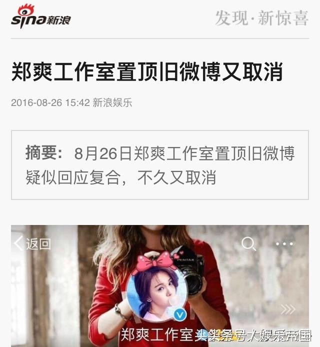 郑爽承认复合,微博置顶去年和胡彦斌秀恩爱微博