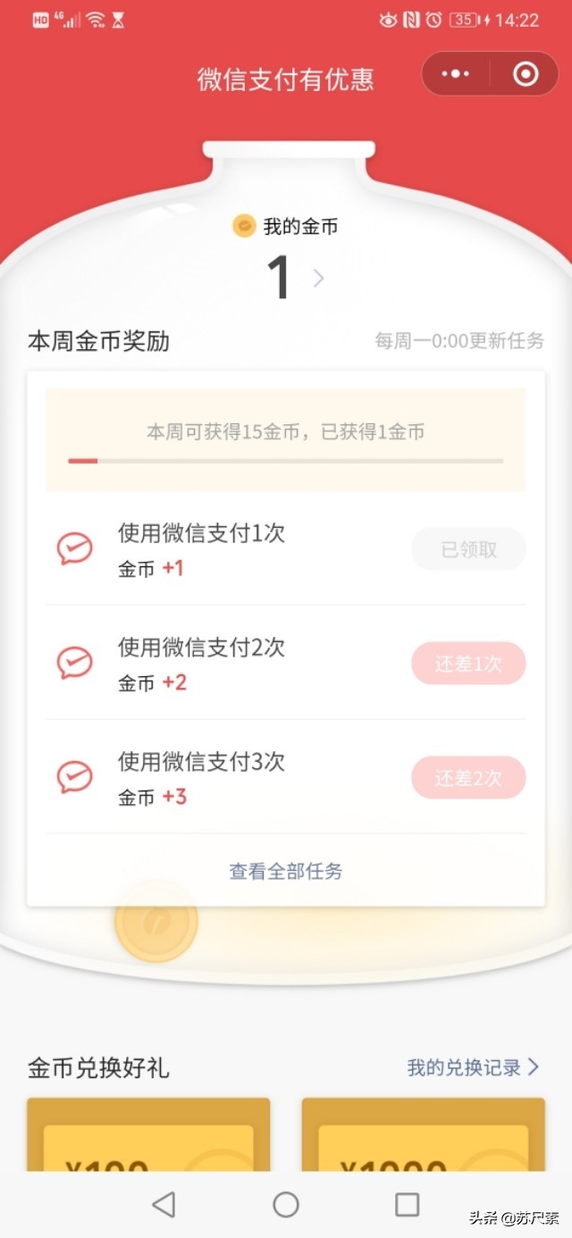只要有使用微信支付,就能领取金币。支付次数越多金币越多。