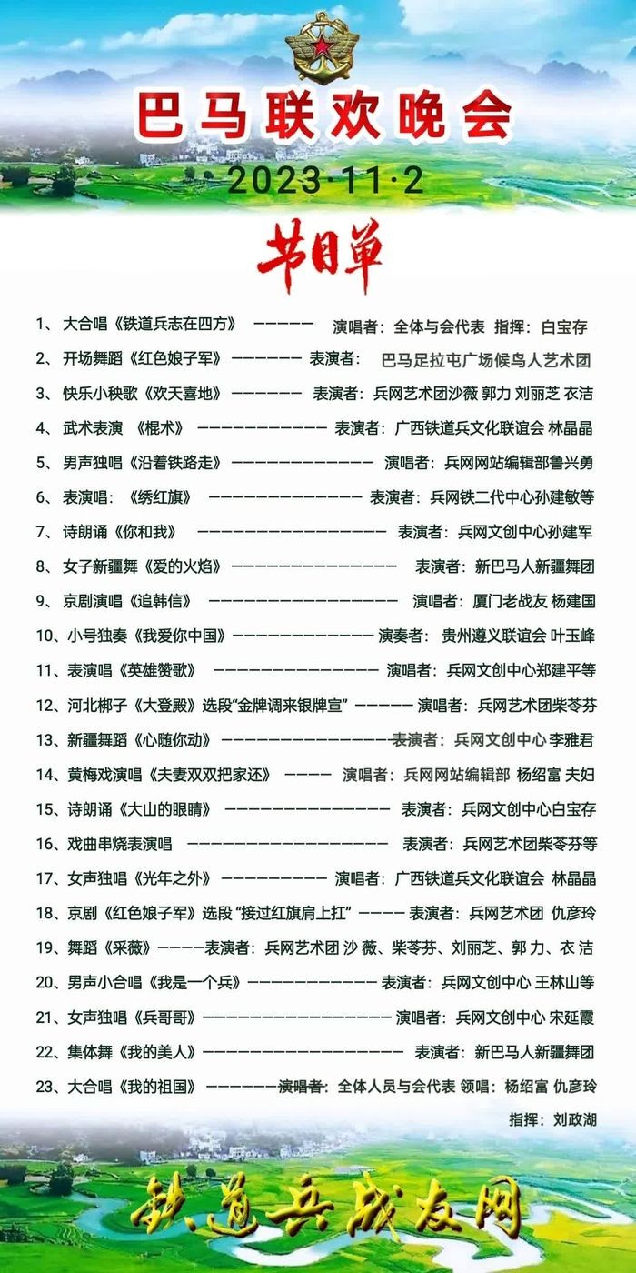 10月31日晚,为弘扬铁道兵精神,传承铁道兵文化,展示铁道兵风采,由铁道兵战友网主办,巴马《铁兵人之家》田园健康养生基地承办,广西铁道兵文化联谊会、广东铁道兵文化联谊会、全国铁友文旅康养服务中心、铁道兵重庆战友联谊会、辽宁铁道兵文化联谊会、江苏省铁道兵文化联谊会、四川成都铁道兵联谊会、铁兵全国旅游协会、遵义铁道兵战友联谊会、西宁铁道兵战友联谊会协办的“走进神奇巴马 铁友欢乐联谊”活动在“世界长寿之乡·中国人瑞圣地”——中国的巴马瑶族自治县甲篆乡《铁兵人之家》田园健康养生基地正式拉开帷幕。