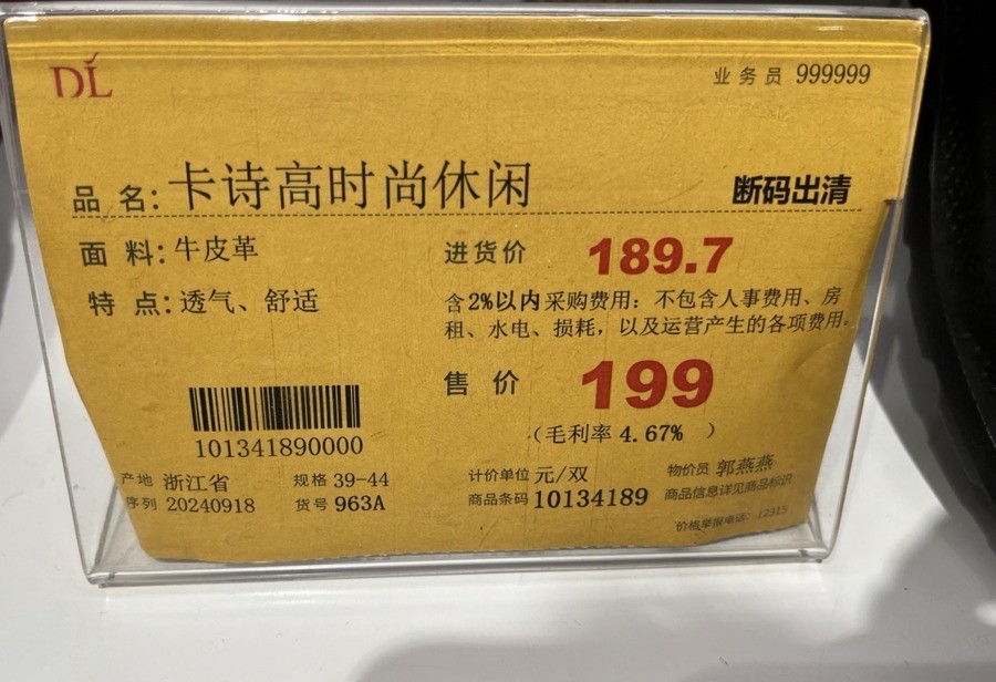 胖东来标有进货价的自营服饰价签。 杨书源 摄