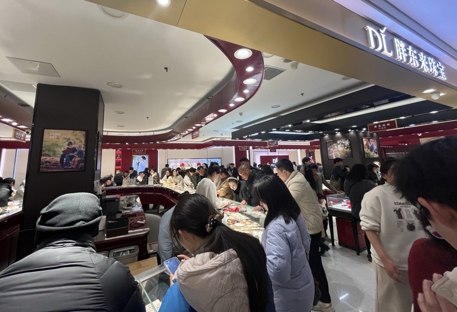 顾客们在胖东来时代广场的黄金柜台前预约抢号、排队选购黄金。 杨书源 摄