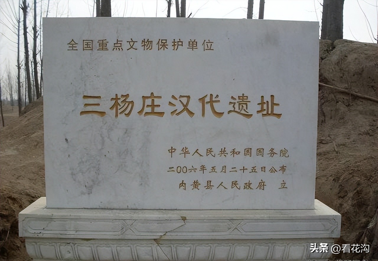 17.内黄县的历史遗迹-三杨庄遗址。位于河南省安阳市内黄县梁庄镇三杨庄村,遗址面积约15万平方米。多为黄沙覆盖,发现有仰韶文化、龙山文化陶片。考古发掘有7处庭院基址,其中4处庭院的发掘,清理出包括屋舍瓦顶、墙体、水井、厕所、池塘、农田、树木等大量重要遗迹。三杨庄遗址庭院的布局、道路、耕作中的农田及各类建筑的墙体等。被洪水浸泡而坍塌的屋顶,保留着板瓦与筒瓦扣合以及坍塌时的原状,来不及搬走的生活实物,如一些石器、陶器、铁器等。遗址内庭院为二进院布局,前后左右相距的距离有远有近,近相距为25米,远超过500米。每家庭院南门外均有通向田间大道宽约5米,地方宽约7米的独家小道。