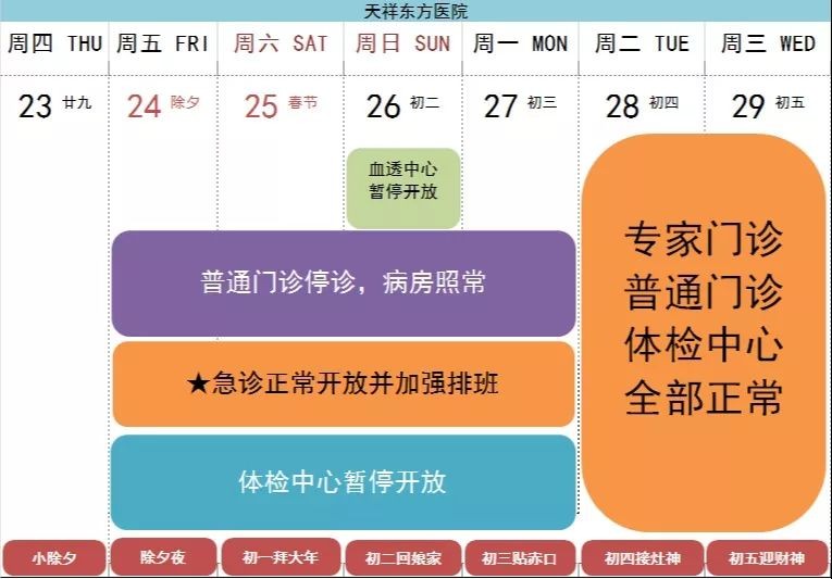 正月初五(1月29日):西医内科、外科、骨伤科、中医内科正常开诊;