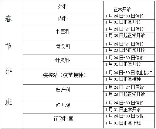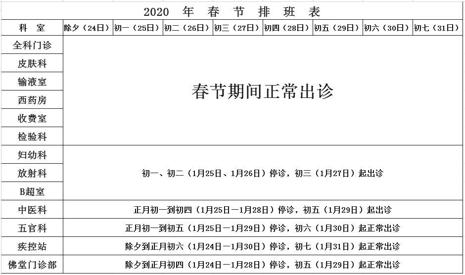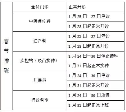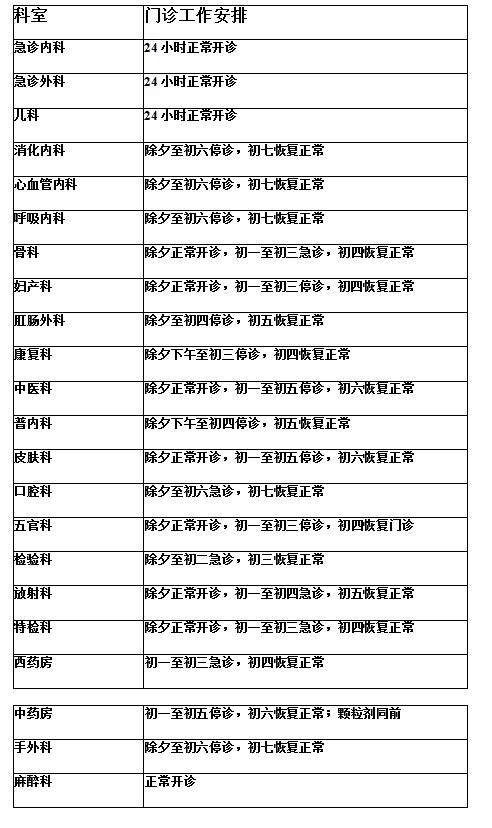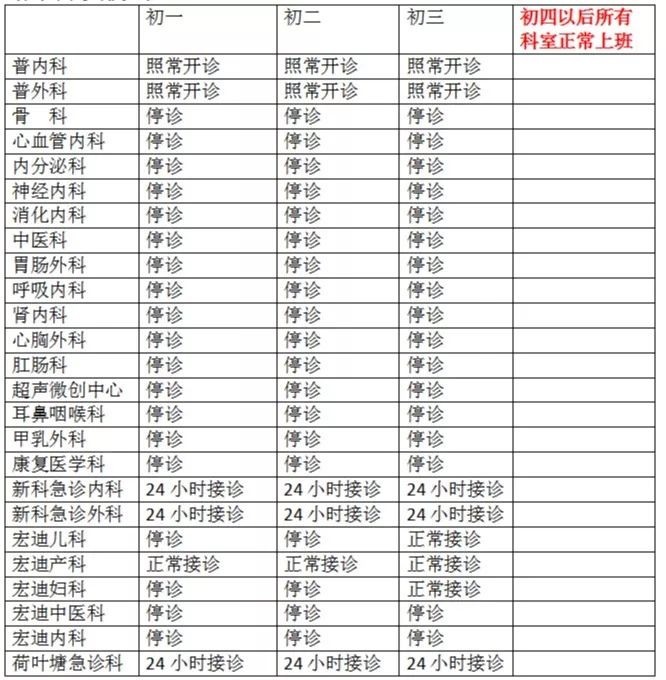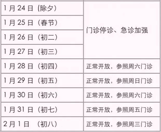 正月初一至初三(1月25日-27日):门诊全部停诊;