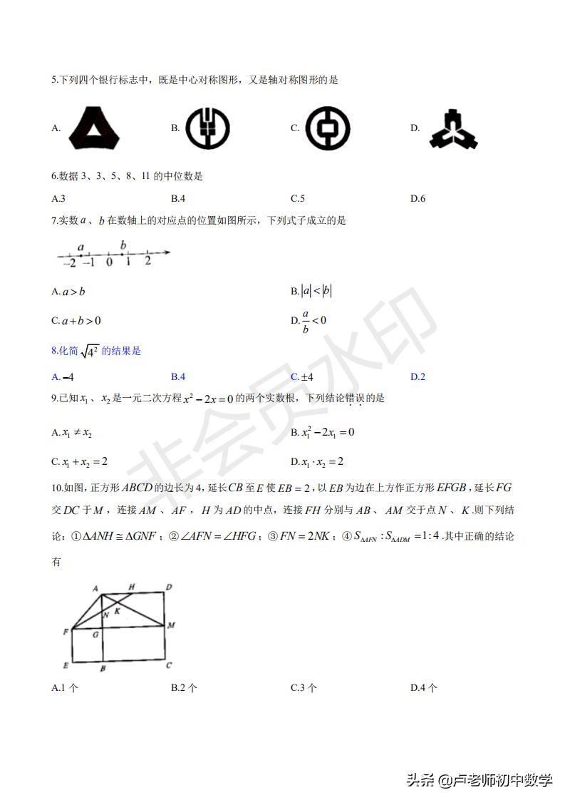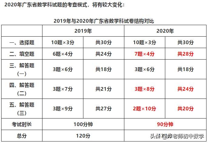 2020年中考改革后的试卷与2019年中考数学试卷对比,题型以及分值变化。