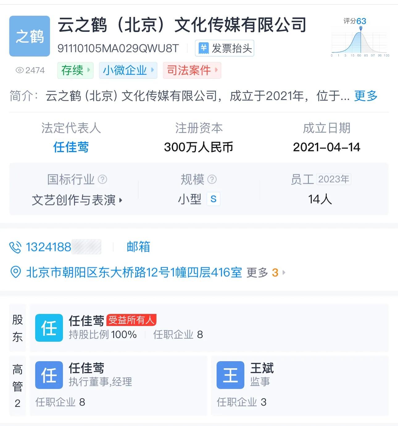 2️⃣云之鹤娱乐,总负责人:任佳莺(原董洁经纪人)。