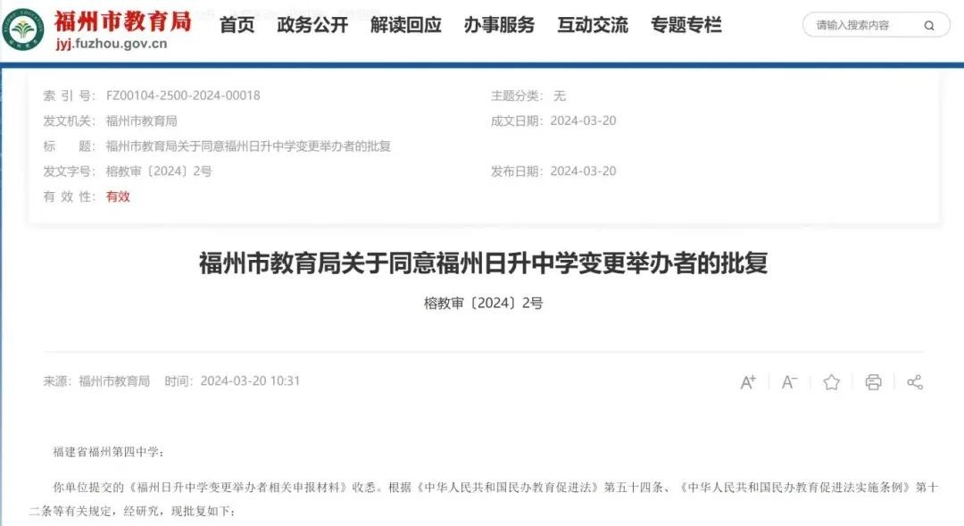 日前,福州市教育局官网公布《关于同意福州日升中学变更举办者的批复》。从批复中获悉,市教育局同意福州日升中学举办方由“福建省福州第四中学”和“海安恒发置业有限公司”变更为“福建省福州第四中学”。