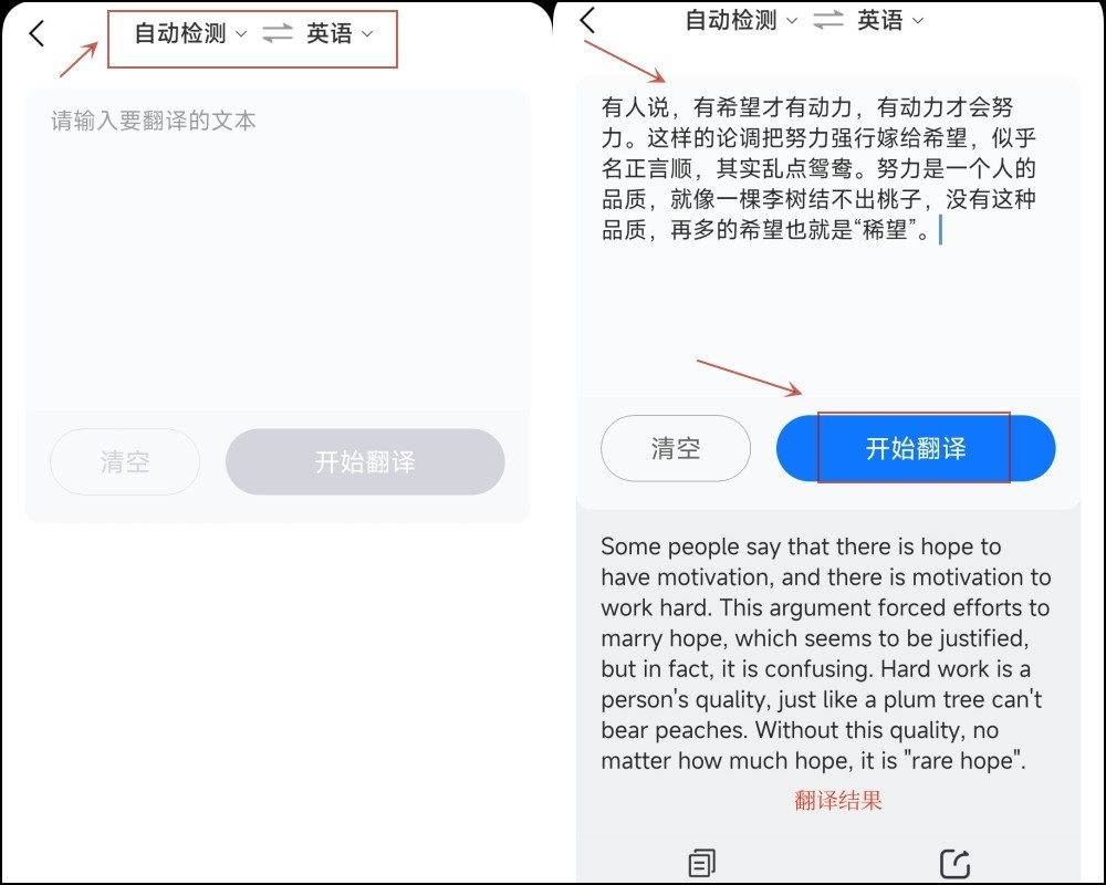 第三步:现在把中文输入或粘贴到相应的文本框中,等待右侧的翻译结果即可。