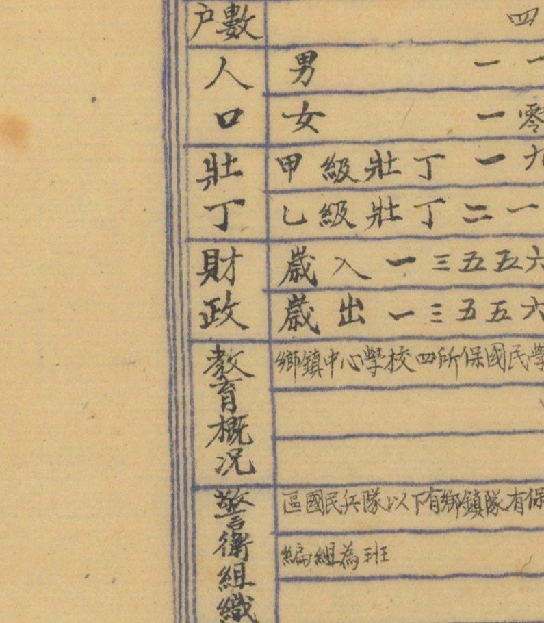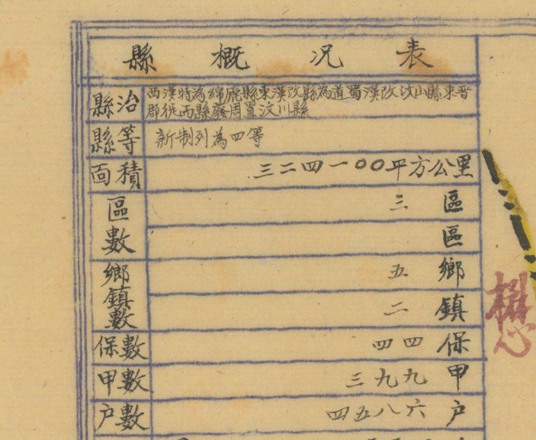 图左侧附县民政资料表,内容丰富。表中可看出民国三十一年左右,汶川县共分为三个区,五个乡、两个镇。表中还详细记述了,保甲数量、人口数量、壮丁数量、财政情况、卫生教育等情况。